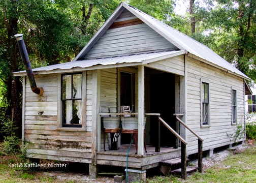 This shotgun style house dates from the 1920s. The two laundry tubs on the porch remind us of a "simpler" time, though I find the thought of hand washing, rinsing, and hanging clothes on a line to dry less than simple.